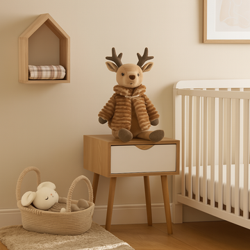 Create a warm and inviting nursery with this charming plush deer, soft bunny basket, and cozy accents. Perfect for snuggles, playtime, and stylish decor that makes every moment special.